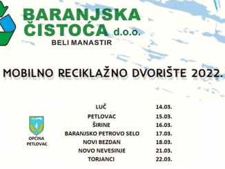 Mobilno reciklažno dvorište Baranjske čistoće će se od ponedjeljka, 14. ožujka, nalaziti na području općine Petlovac.,Radno vrijeme je od 08:00 ….