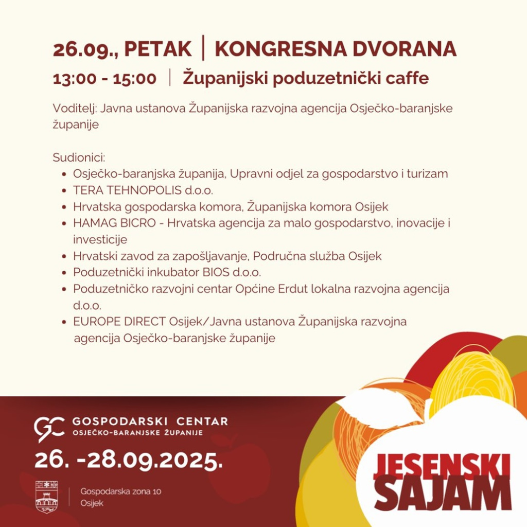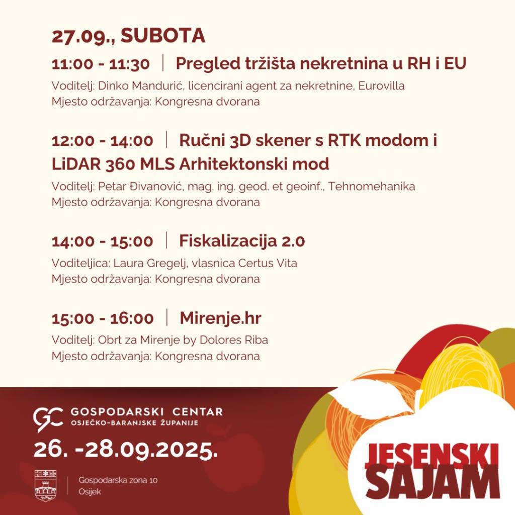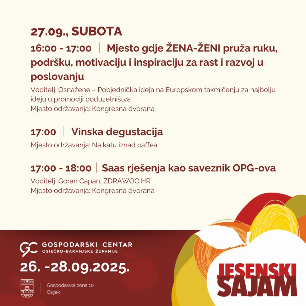 U Gospodarskom centru Osječko-baranjske županije u Osijeku u petak (26. rujna 2025. godine) u 10.00 sati bit će svečano otvorenje 28. Jesenskog sajma. Tijekom tri dana, zaključno s nedjeljom, 28. rujna, Sajam je otvoren za sve zainteresirane posjetitelje od 10.00 do 19.00 sati, naravno ulaz i parking su i ovaj put besplatni.