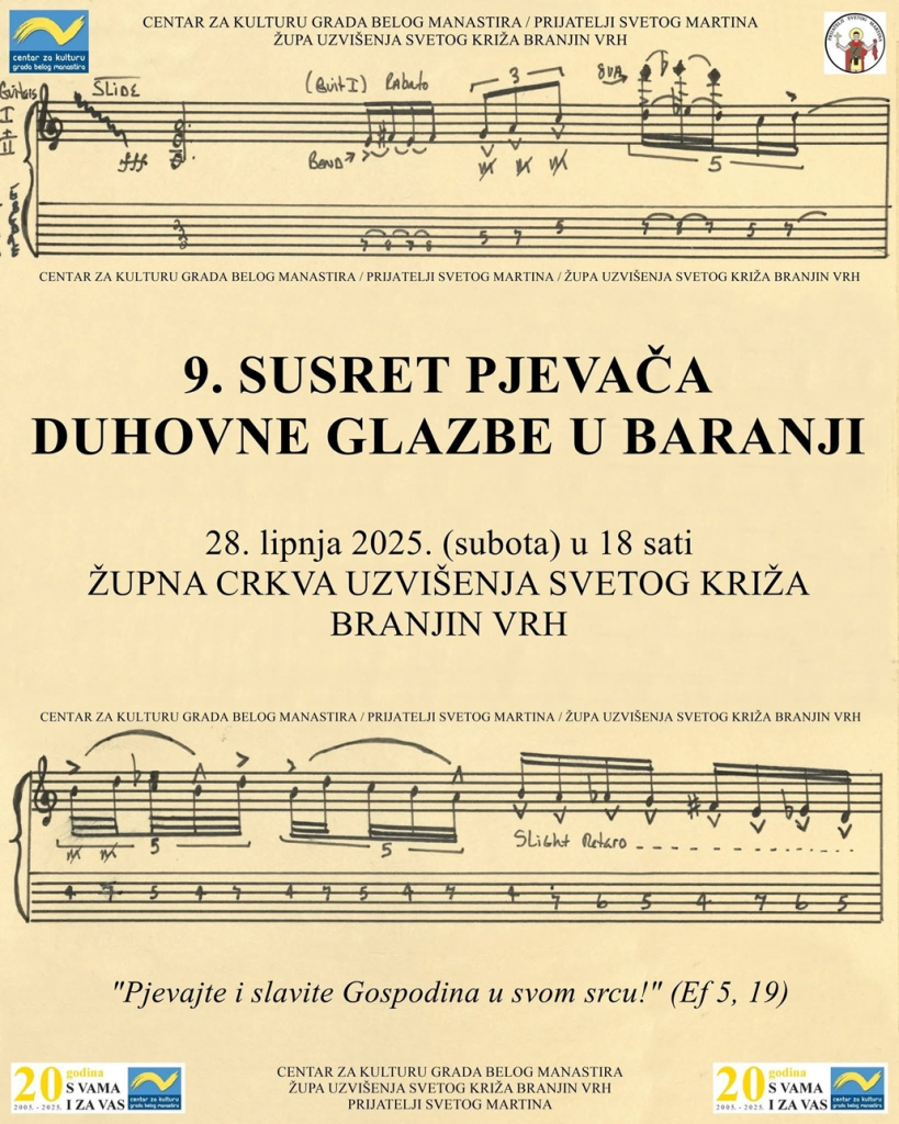 Centar za kulturu Grada Belog Manastira u suradnji s Prijateljima svetog Martina i Župom uzvišenja sv. Križa Branjin Vrh organizira 9. susret pjevača duhovne glazbe u Baranji 28. lipnja 2025. u 18 sati u Župnoj crkvi uzvišenja sv. Križa Branjin Vrh. Pokrovitelj susreta je Grad Beli Manastir. Ulaz je slobodan.