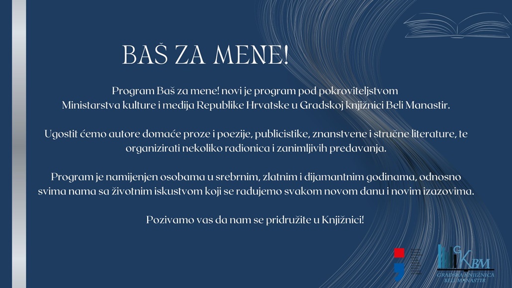 Gradska knjižnica Beli Manastir predstavlja novi program koji je namijenjen osobama u srebrnim, zlatnim i dijamantnim godinama, naziva Baš za mene!