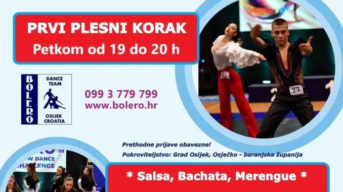 Plesni klub “Bolero” Osijek u suradnji s Gradom Osijekom i Osječko – baranjskom županijom provodi projekt “PRVI PLESNI KORAK 2026.” – besplatne plesne radionice karipskih plesova – Salsa, Bachata i Merengue za studente i srednjoškolce u trajanju dva mjeseca – PRIJAVITI se možete do 16. travnja a u nastavku vam donosimo kratko sažete informacije o samom tečaju te kome se možete javiti: