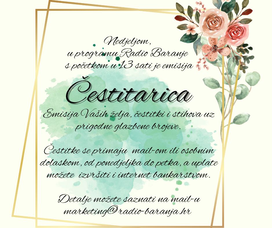 Nedjeljom, u programu Radio Baranje s početkom u 13 sati je emisija ČESTITARICA.
