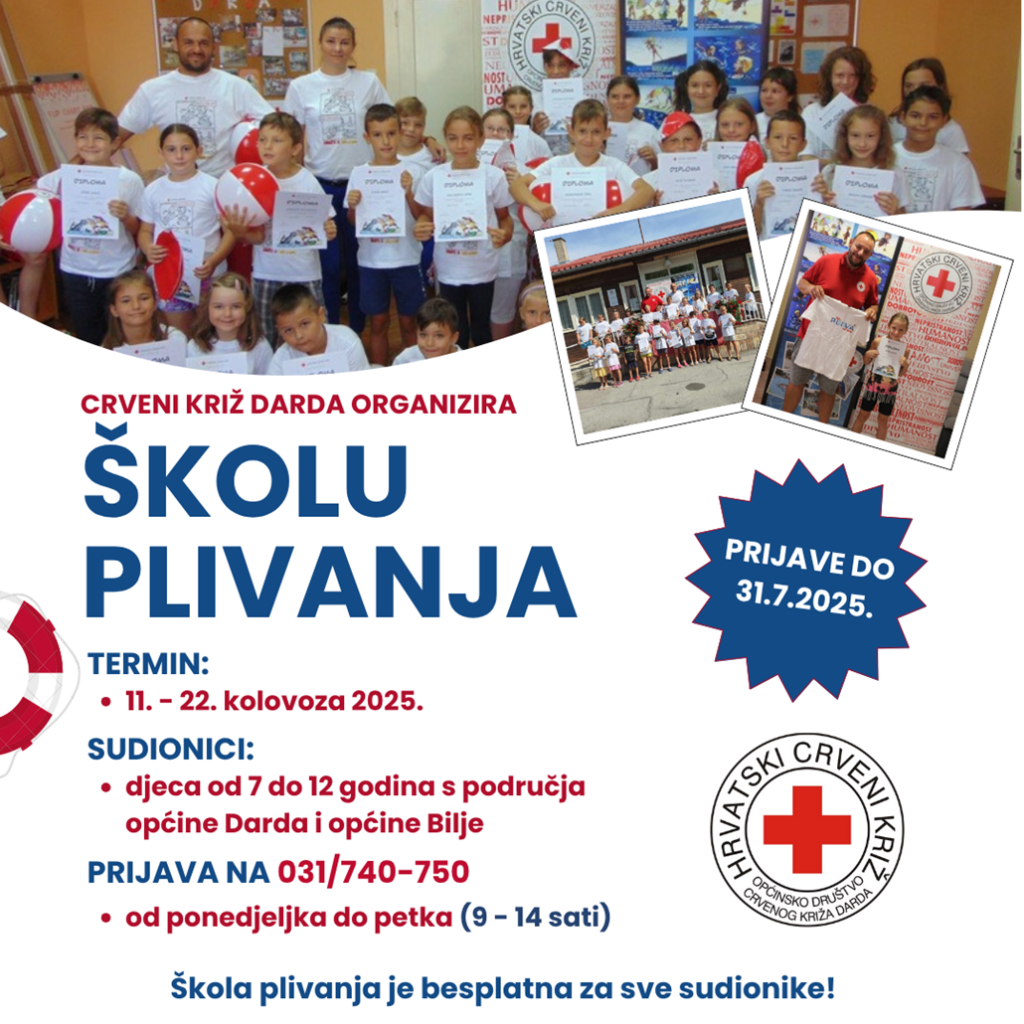 Škola plivanja održat će se od 11. do 22. kolovoza 2025. godine na Gradskim bazenima u Belom Manastiru, a svi troškovi (prijevoz i ulaznice) osigurani su od strane Crvenog križa Darda.