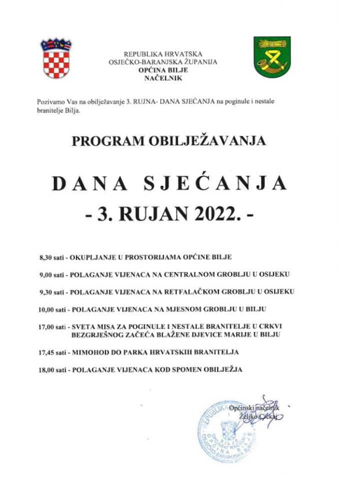 Načelnik Općine Bilje Željko Cickaj poziva vas na obilježavanje 3.rujna – Dana sjećanja na tragičnu pogibiju branitelja Bilja.