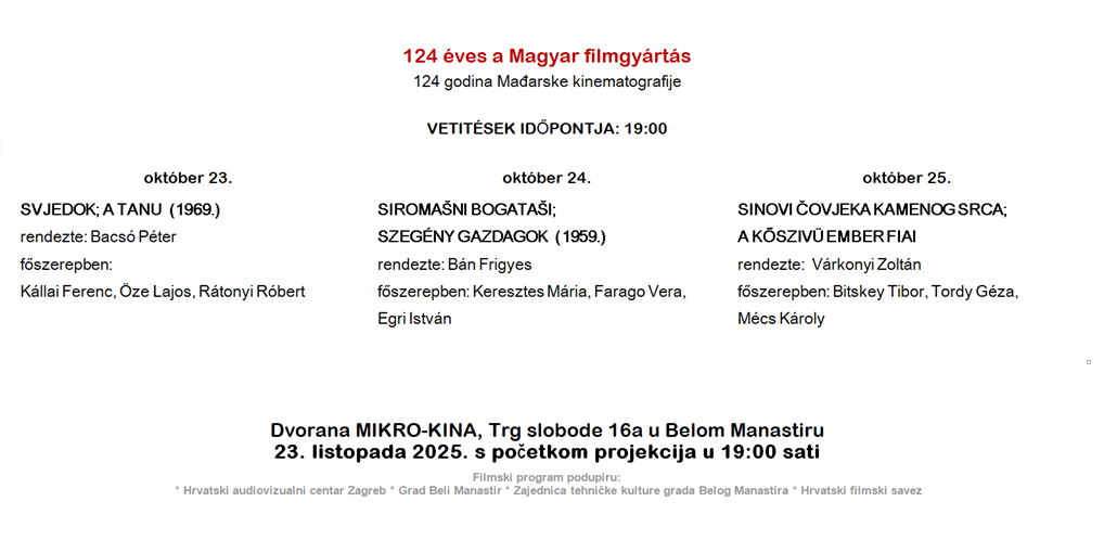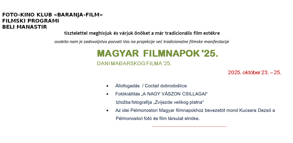 Foto-kino klub “Baranja-film” Beli Manastir poziva sve zainteresirane na projekcije tradicionalne filmske manifestacije – Dani mađarskog filma, koja će se održati 23., 24. i 25. listopada u prostoru Mikro kina u Belom Manastiru, sve s početkom u 19 sati.