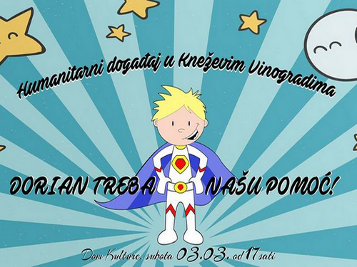 U Domu kulture u Kneževim Vinogradima organizira se izložba fotografija petorice baranjskih autora u svrhu skupljanja financijske pomoći za malog Doriana. Osim fotografija, na aukciji će biti ponuđene i dvije skulpture od papira umjetnika iz Osijeka i set 4 DVD-a nogometnih driblinga iz Lugana (Švicarske), te ćete moći degustirati baranjska vina, suhomesnate proizvode i kolače i donirati sredstva za pomoć. Tijekom cijelog događaja moći ćete uživati u nastupima H&M, BestMan Band. Svi ste pozvani 3.3. (subota) da sudjelujete u ovoj humanitarnoj akciji i da ujedinjenim snagama pomognemo Dorianu pobijediti u ovoj teškoj bitci!