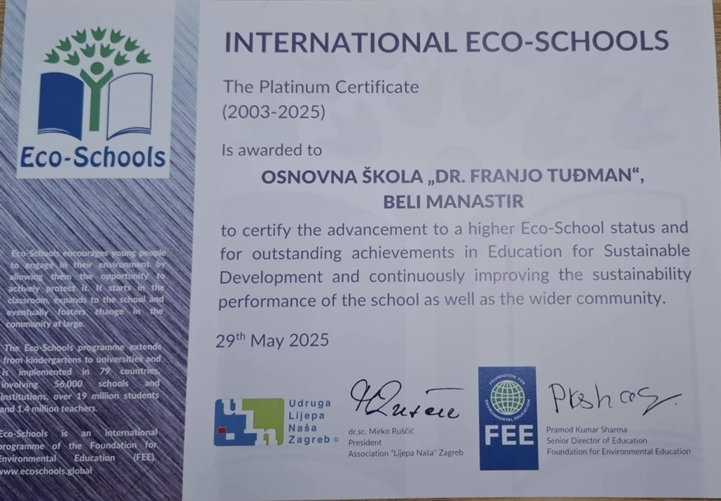 To znači da su u cijelosti ispunili uvjete iz smjernica za provedbu programa Ekoškole i uredno izvršili sve potrebne radnje za obnavljanje ovog međunarodnog priznanja. OŠ „Dr. Franjo Tuđman“ Beli Manastir pripada Eko školama 3. generacije koje nakon 22 godine programa Ekoškole potvrđuju platinasti status.