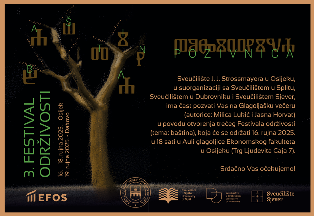 Sveučilište J.J. Strossmayera u Osijeku poziva sve zainteresirane na 3. Festival održivosti koji će se održati od 16. do 18. rujna u Osijeku, u sklopu čijeg je otvorenja organizirana Glagoljaška večer s početkom u 18 sati, 16. rujna na Ekonomskom fakultetu.