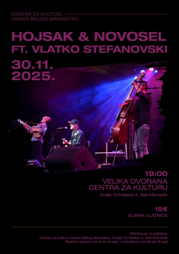 U sklopu obilježavanja Dana Grada Belog Manastira, Centar za kulturu poziva sve zainteresirane na koncert Hojsak & Novosel ft. Vlatko Stefanovski, koji će se održati 30. studenog 2025. godine u velikoj dvorani Centra za kulturu u Belom Manastiru.