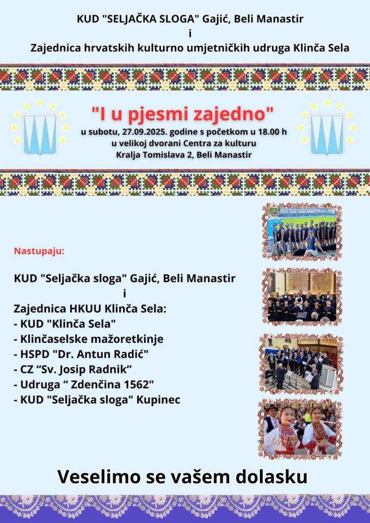 KUD Seljačka sloga Gajić i Zajednica hrvatskih kulturno umjetničkih udruga Klinča Sela pozivaju sve zainteresirane na koncert „I u pjesmi zajedno“, koji će se održati u subotu 27. rujna u 18 sati u Velikoj dvorani Centra za kulturu Grada Belog Manastira. Ulaz je slobodan.