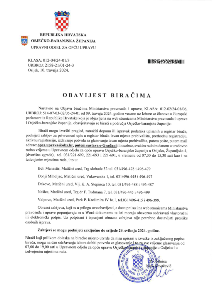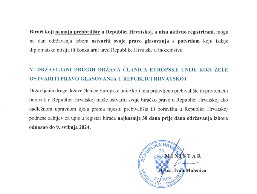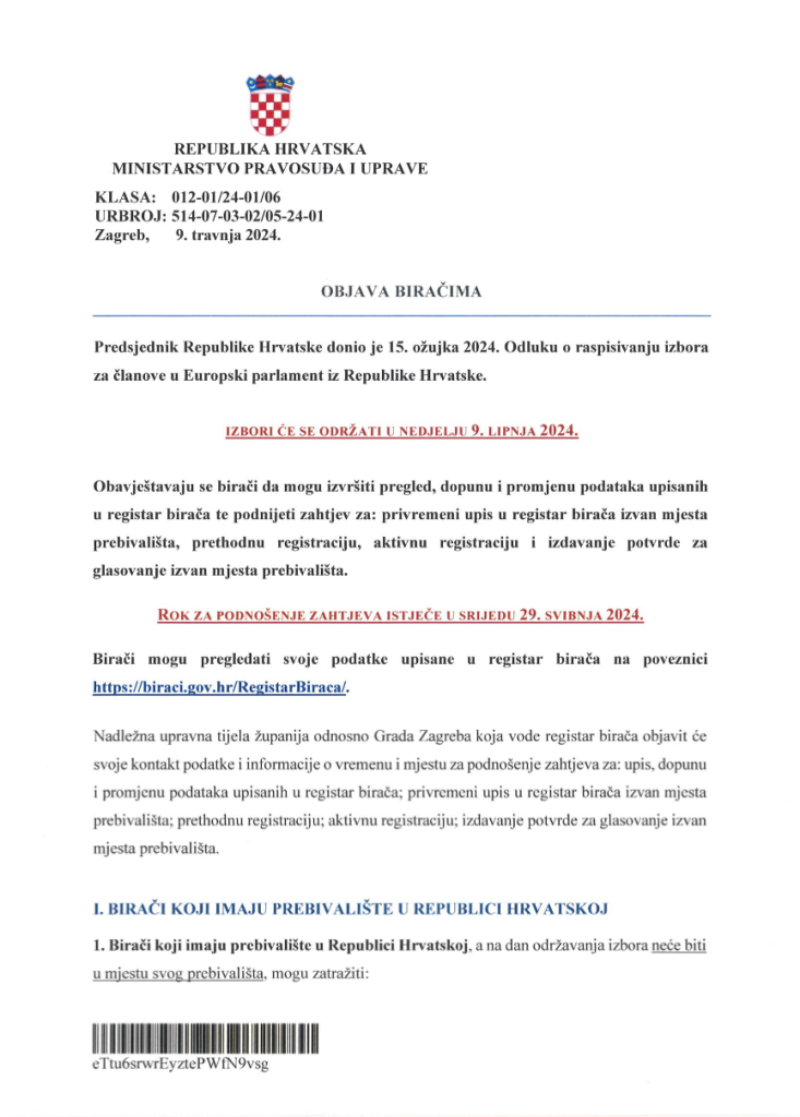 Izbori za članove u Europski parlament 2024. godine – objava i obavijest biračima