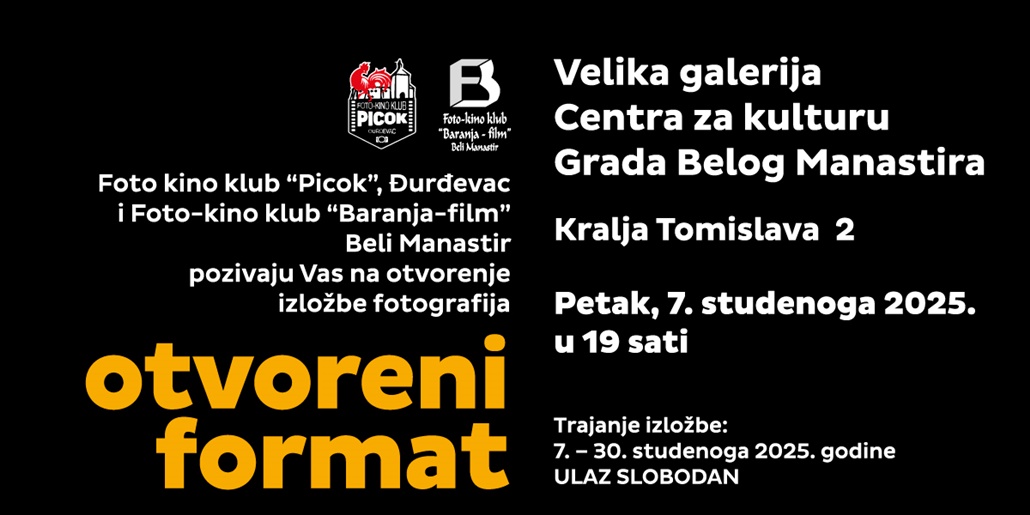 Izložba fotografija pod nazivom Otvoreni format održat će se 7. studenoga u Velikoj galeriji Centra za kulturu Grada Belog Manastira s početkom u 19 sati. Izložba je organizirana u okviru programa međuklupske suradnje Foto-kino kluba Picok Đurđevac i Foto-kino kluba Baranja-film Beli Manastir te će biti prikazane fotografije članova Foto-kino kluba Picok Đurđevac.