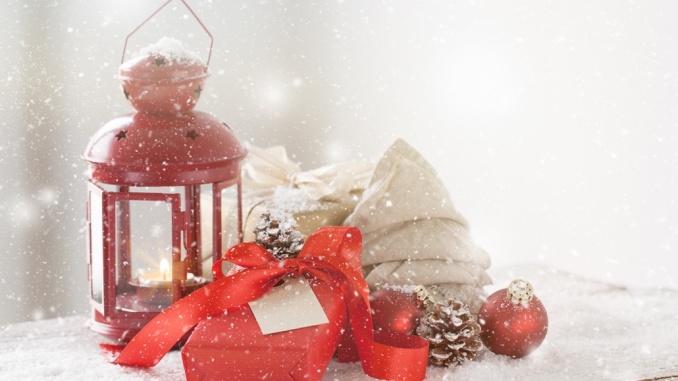 Christmas presents or gifts with elegant bow and christmas decorations on bright snowy background, christmas concept
