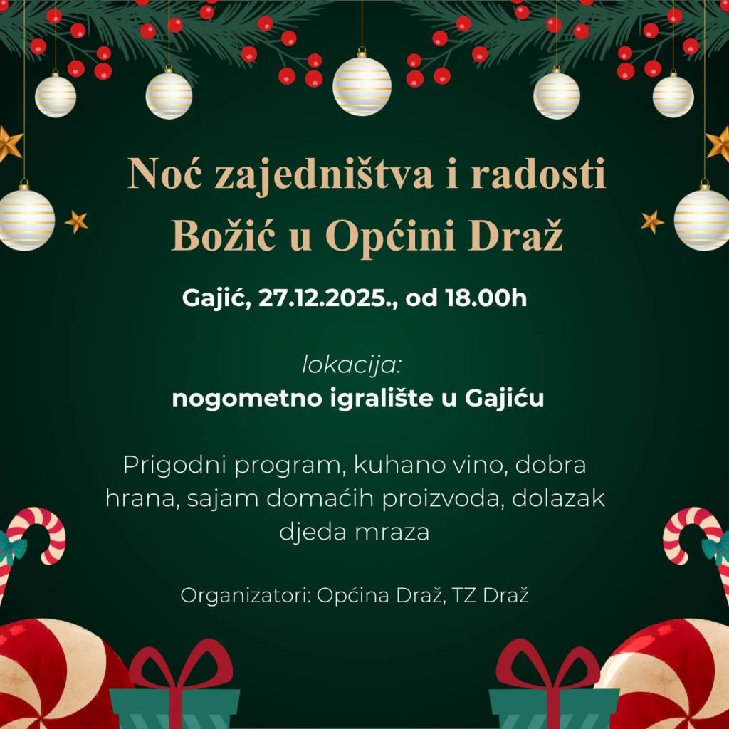 Iz Općine Draž 27. prosinca 2025. pozivaju sve zainteresirane subjekte, koji se žele predstaviti sa svojim proizvodima, da se prijave na vrijeme.