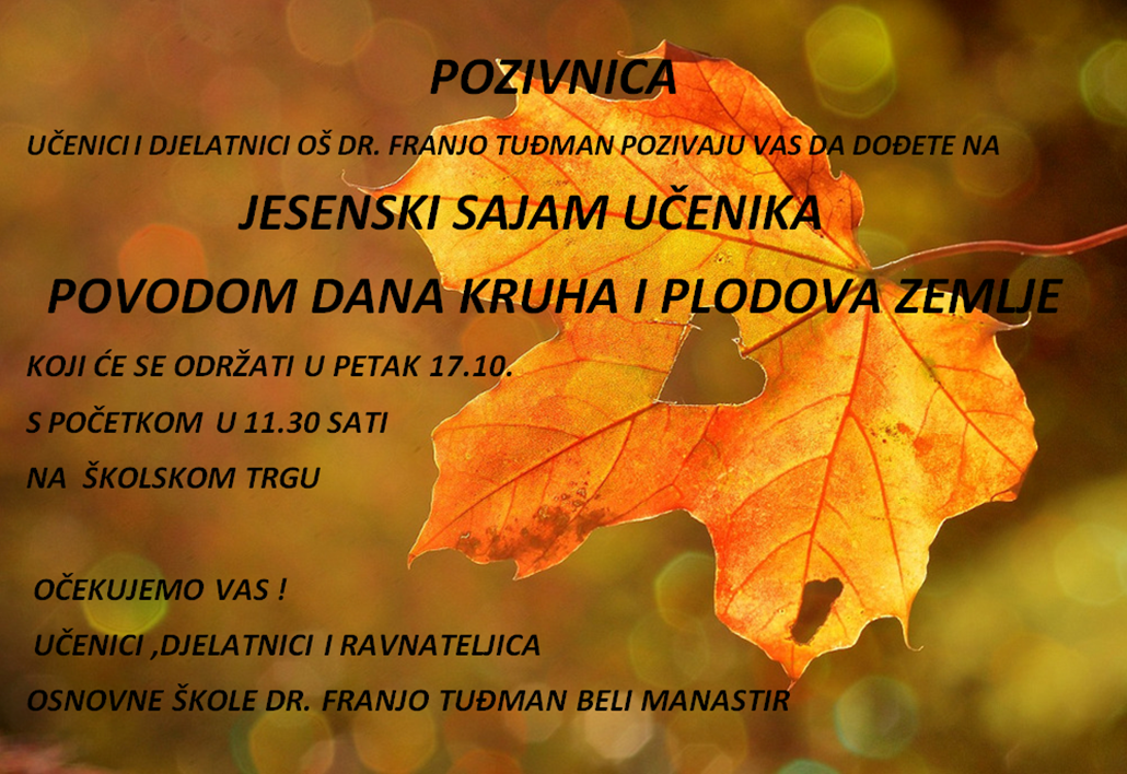 Osnovna škola “Dr. Franjo Tuđman” povodom dana kruha i plodova zemlje poziva sve zainteresirane na Jesenski sajam koji će se održati 17. listopada 2025. godine s početkom u 11:30 sati na školskom trgu.