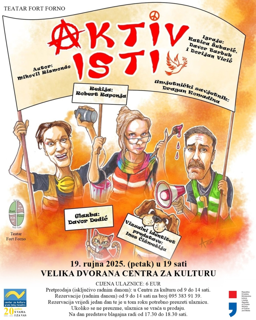 Centar za kulturu Grada Belog Manastira i Teatar Fort Forno pozivaju sve zainteresirane na kazališnu predstavu “Aktivisti”, koja će se odigrati 19. rujna 2025. godine (petak) s početkom u 19 sati u velikoj dvorani Centra za kulturu u Belom Manastiru.
