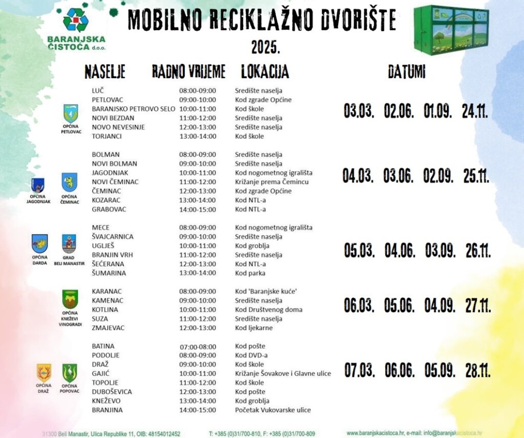 Podsjetimo, mobilno reciklažno dvorište pokretna je tehnička jedinica koja služi odvojenom prikupljanju i skladištenju manjih količina posebnih vrsta otpada iz kućanstva. Za ostali otpad poput glomaznog ili problematičnog, korisnicima Baranjske čistoće omogućeno je odlaganje na fiksnim reciklažnim dvorištima kojima tvrtka upravlja.
