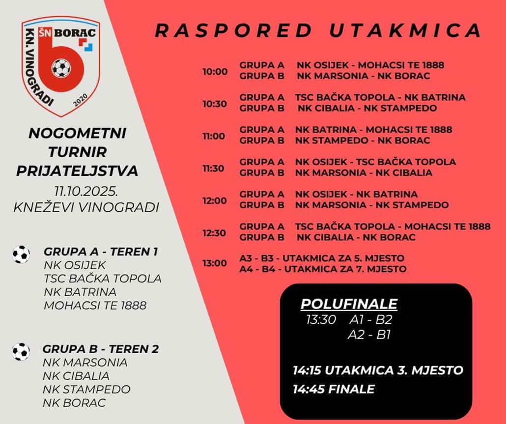 Nogometna škola NK Borac poziva sve zainteresirane na prijateljski nogometni turnir za početnike (2015./2016.), u subotu, 11. listopada 2025. godine na nogometnom terenu NK Borac u Kneževim Vinogradima.