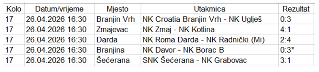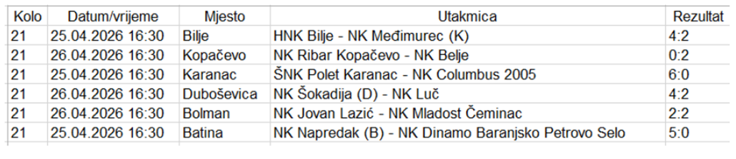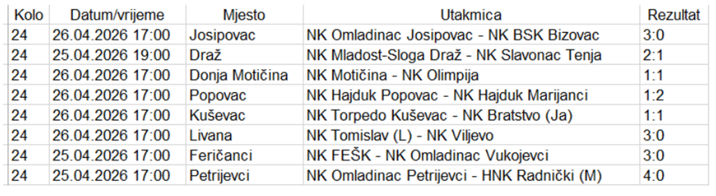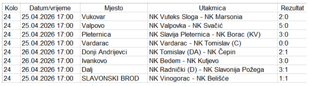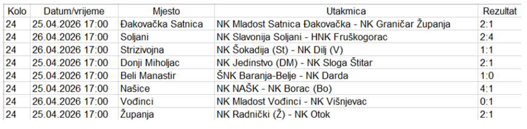 Treća nogometna liga Istok 25./26., 1. koloVardarac: NK Vardarac – NK Bedem, 3:1Kneževi Vinogradi: NK Borac – NK Kutjevo, 2:2 ….