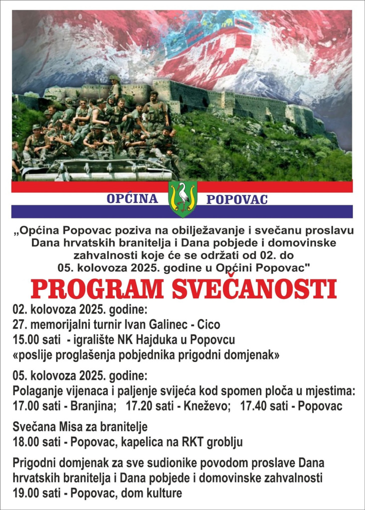 Općina Popovac poziva na obilježavanje Dana hrvatskih branitelja, Dana pobjede i domovinske zahvalnosti koje će se održati od 2. do 5. kolovoza 2025. godine.