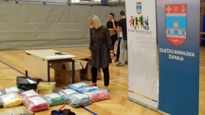Školski športski savez Osječko-baranjske županije u suradnji s županijom i Hrvatskim školskim sportskim savezom kupio je komplete dresova za školska sportska društva koja djeluju na području Osječko-baranjske županije te hoodie majice za profesore/nastavnike tjelesne i zdravstvene kulture. Jučer su darovi u sportskoj dvorani uručeni predstavnicima športskih školskih društava 11 osnovnih i 3 srednje škole iz Baranje. Opremu su uručili glavni tajnik Športske zajednice Dubravko Ižaković i naša poznata veslačica i tajnica saveza Mirna Rajle.