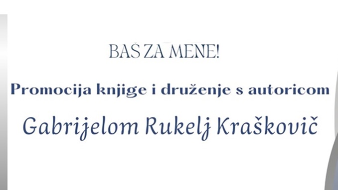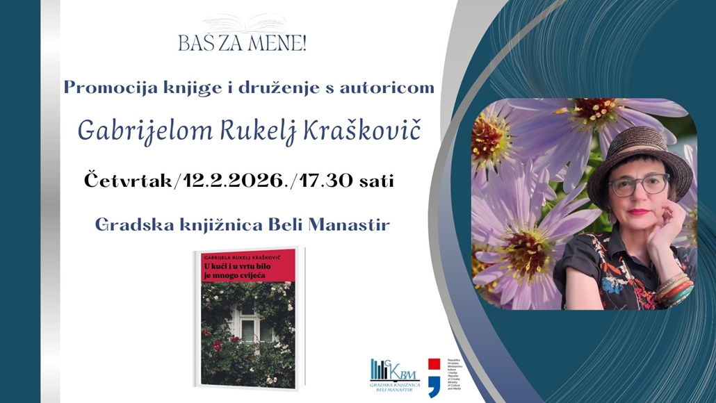 U sklopu novog programa Baš za mene! Gradske knjižnice Beli Manastir, 12. veljače 2026. godine od 17:30 održat će se promocija knjige i druženje s autoricom Gabrijelom Rukelj Kraškovič, u prostoru knjižnice.