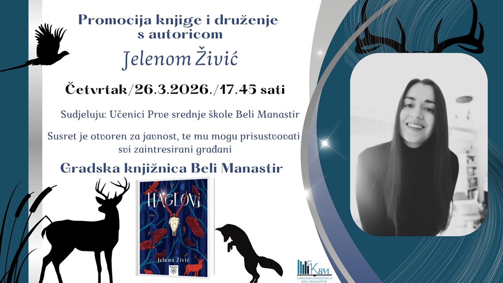 U Gradskoj knjižnici Beli Manastir, 26. ožujka 2026. godine od 17:45 održat će se promocija knjige i druženje s autoricom Jelenom Živić, u prostoru knjižnice. Autorica će predstaviti svoj prvi roman “Haglovi”.