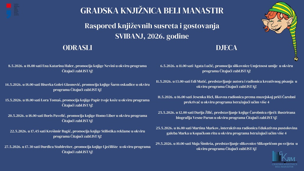 Gradska knjižnica Beli Manastir objavila je raspored književnih susreta i gostovanja za cijeli mjesec svibanj 2026. godine – da se unaprijed znamo pripremiti i osloboditi termine! Susreti i gostovanja provodit će se u sklopu projekata Čitajući zabLISTAJ! i Baš za mene!