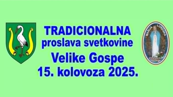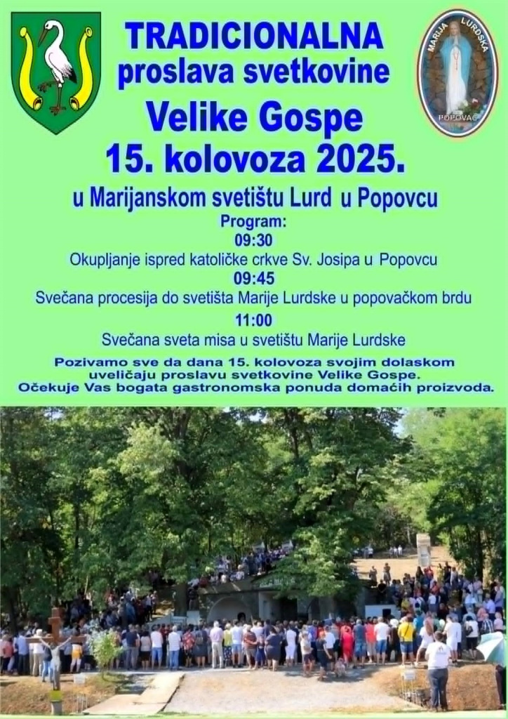 Općina Popovac i ove godine poziva na tradicionalnu proslavu svetkovine Velike Gospe 15. kolovoza u Marijanskom svetištu Lurd u Popovcu.