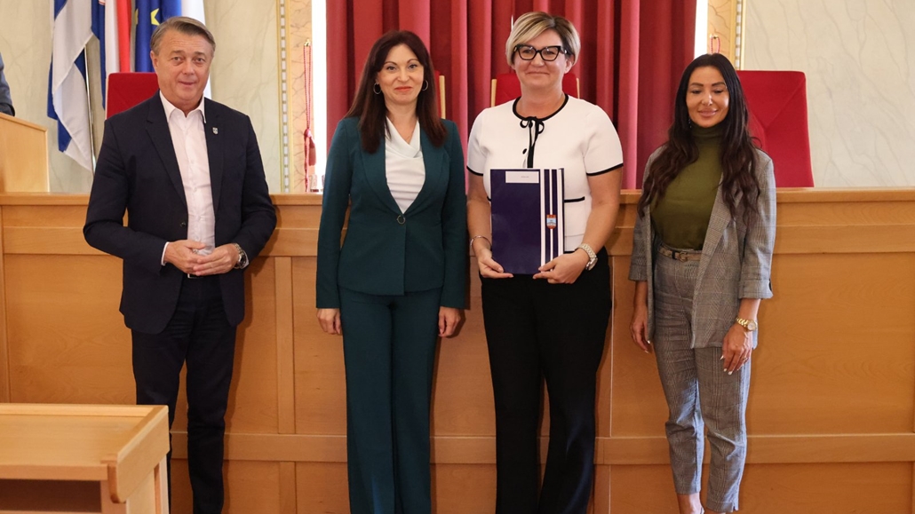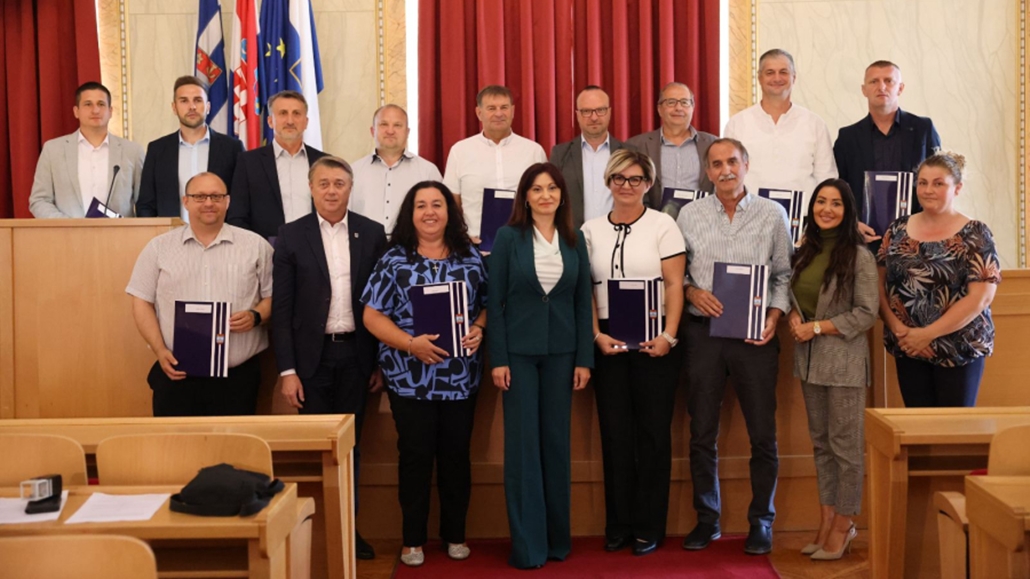Županica Nataša Tramišak je predstavnicima 14 jedinica lokalne samouprave s područja Osječko-baranjske županije uručila ugovore o dodjeli pomoći za projekte društvene, komunalne i povezane infrastrukture. Za tri općine ugovori su uručeni prije nekoliko dana tako da je na temelju samo ovog javnog poziva Osječko-baranjska županija ove godine izdvojila ukupno 486.000,00 eura za 17 infrastrukturnih projekta JLS s područja županije.
